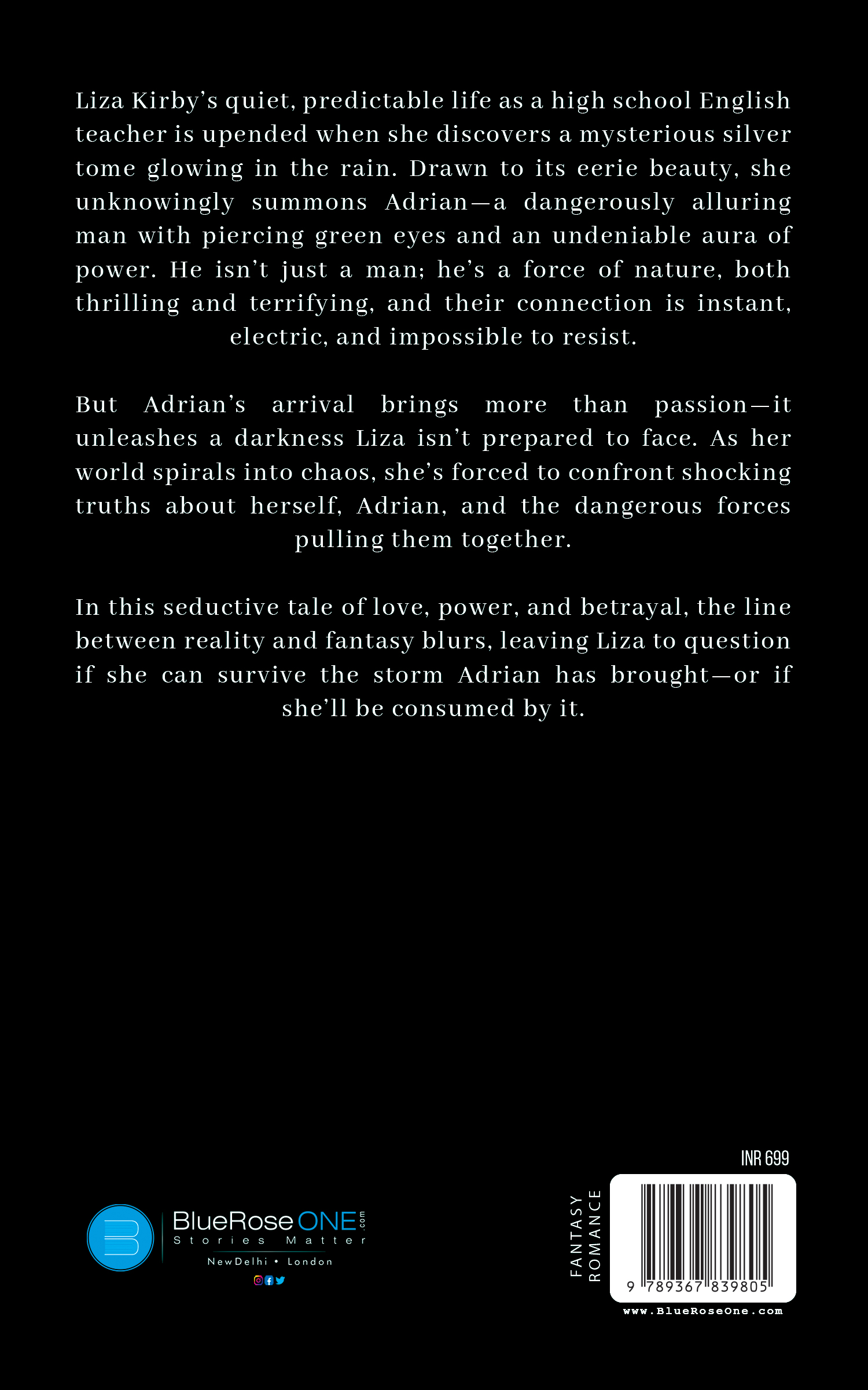 Liza Kirby, a dedicated high school English teacher, leads a quiet and predictable life until a fateful encounter with a mysterious silver tome changes everything. When she reads from the book, she unwittingly summons Adrian, a dangerously captivating man who warns her of the dire consequences if he isn’t sent back.